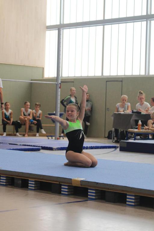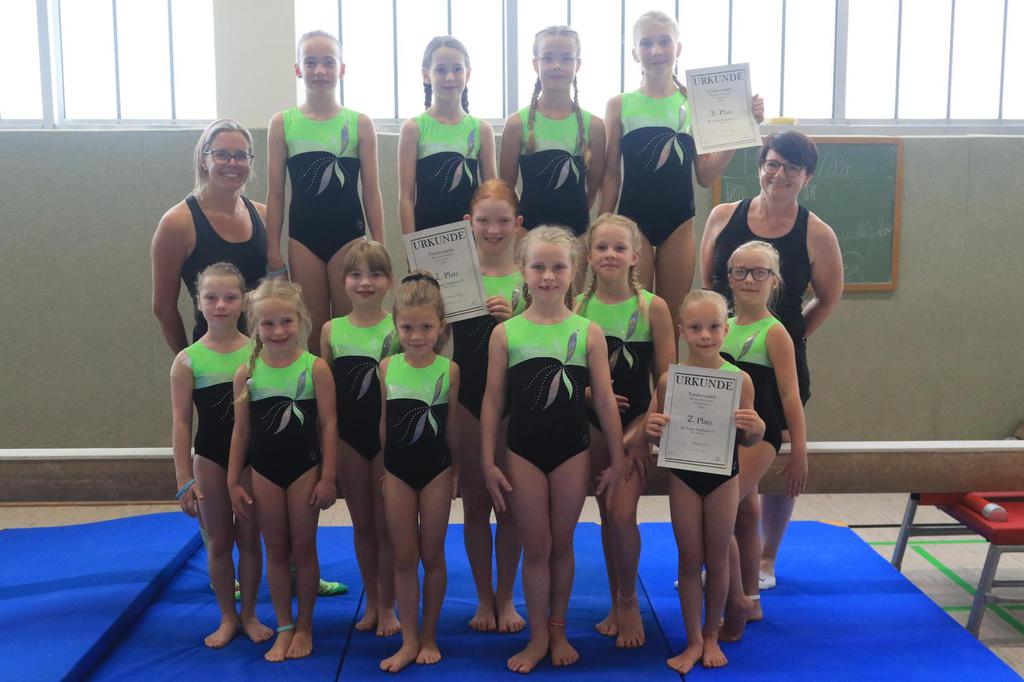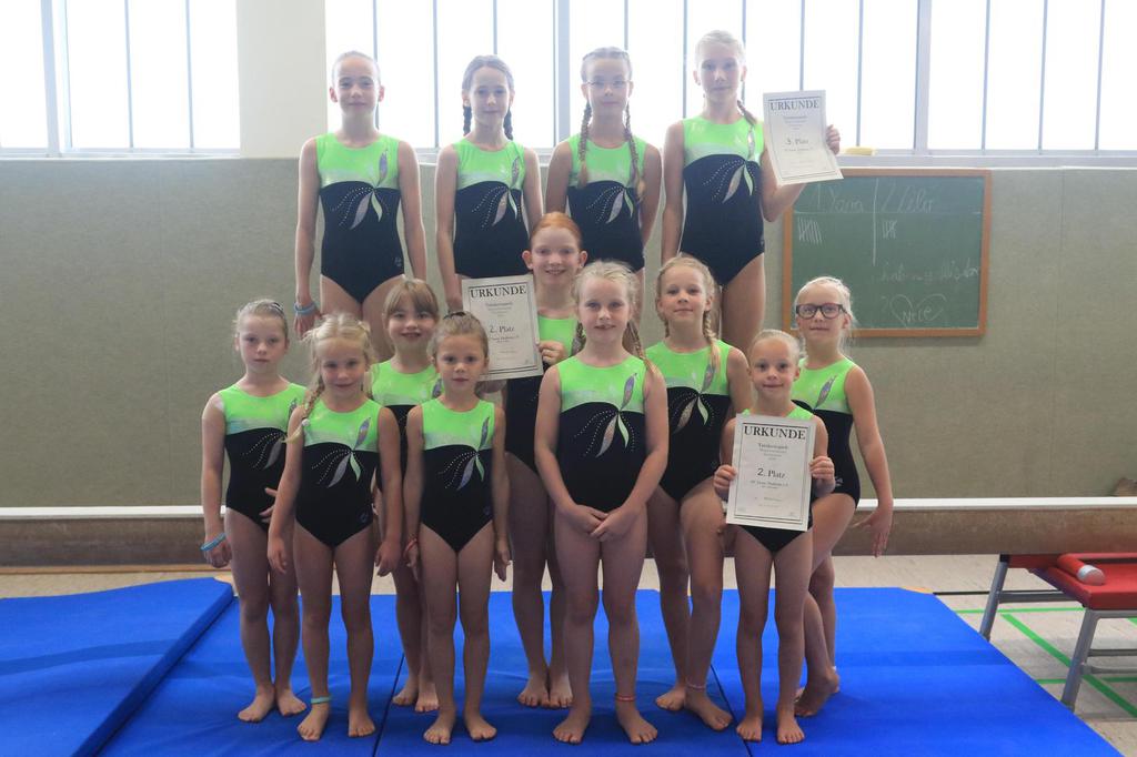 In der Pflicht hat eine Mannschaft bis zu 5 Turnerinnen, davon gehen jeweils 4 ans Gerät und die besten 3 kommen in die Wertung. Da Ella Sonntag (AK7) und Helene Scheibner (AK 11) wegen privatem Paralleltermin nicht antreten konnten, waren wir in den beiden Altersklassen nur zu viert am Start. In der AK bis 7 Jahre (hier turnten Sally Vieweger, Tilda Reif, Nele Meinel und Coco Albert) und AK bis 9 Jahre (mit Emma Päßler, Marie Schauer, Thia Reumuth, Clara Kaiser und Hermine Baer) konnten wir jeweils Platz 2 hinter den Gastgebern aus Lugau bzw. den Turnerinnen aus Chemnitz erturnen. Die Mannschaft der AK11 mit Helene Lasch, Lena Kaden, Elise Illgen und Johanna Fleischer erturnte sich Platz 3. Hier siegte die Mannschaft aus Chemnitz, die Gastgeber aus Lugau belegten Platz 2.